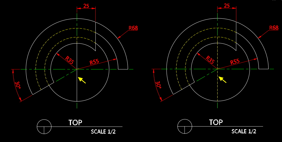 평면도의 TOP 부분에서 중심 숨은선이 실선으로 잘못 표기